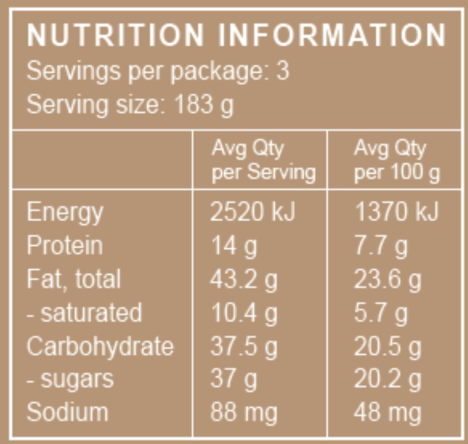 Ingredients: Almond meal*, Eggs*, Coconut Cream*, Maple Syrup*, Coconut Sugar*, Olive Oil*, Dates*, Vanilla Bean*, Lemon, Juice*, Baking Powder*, Bicarb Soda*, Cinnamon, Ginger (*indicates organic ingredients)