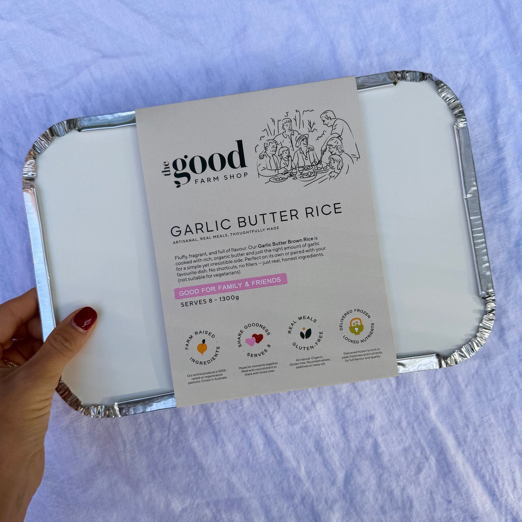 Fluffy, fragrant, and full of flavour. Our Garlic Butter Brown Rice is cooked with rich, organic butter and just the right amount of garlic for a simple yet irresistible side. Perfect on its own or paired with your favourite dish. No shortcuts, no fillers — just real, honest ingredients. (not suitable for vegetarians)